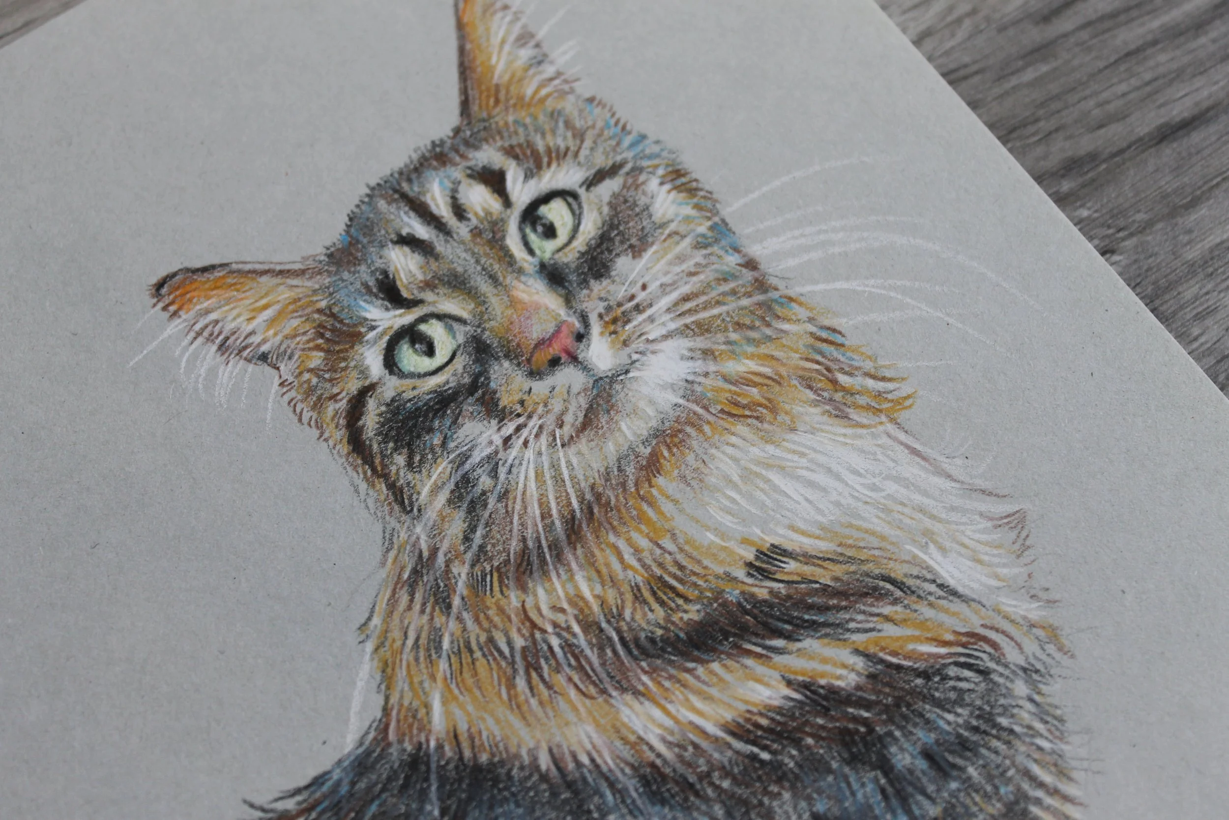 Portrait de chat au crayon de couleur d’après photo. Format A5.